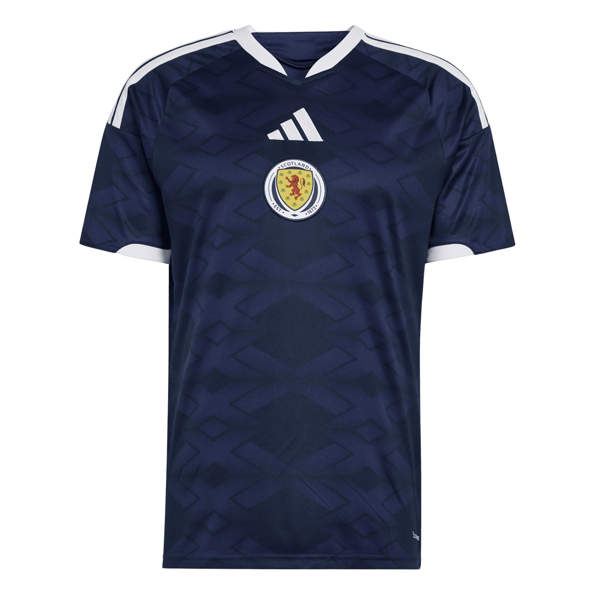 The shirt features a deep navy base with a subtle tonal pattern inspired by the Saltire (St. Andrew’s Cross). White adidas Three Stripes run along the shoulders and white trim finishes the collar and cuffs — all symbols of Scotland’s football identity. The 2026 Scotland Home Jersey brings these cues together with performance‑tier fabric that keeps you comfortable whether you’re supporting from the stands or wearing it casually.